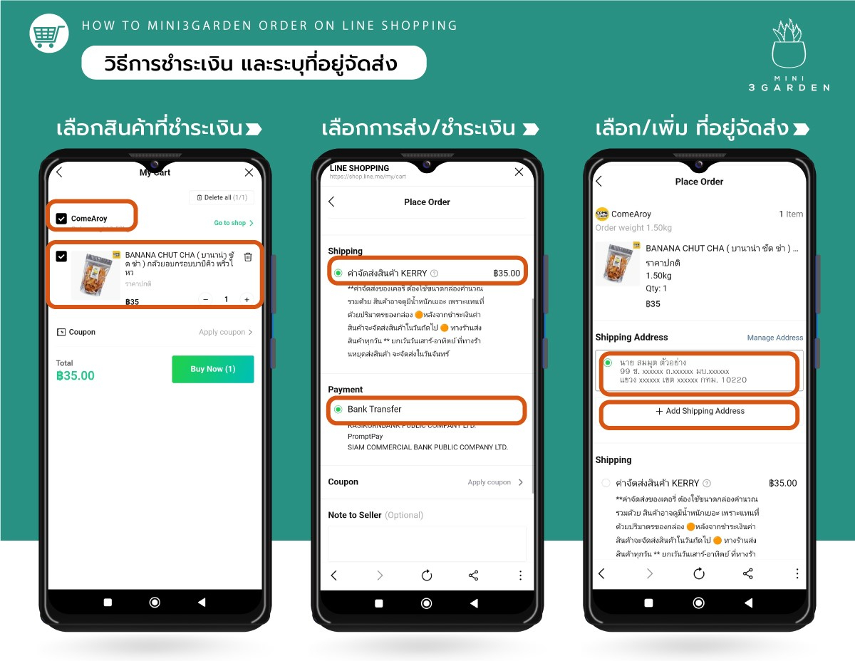 6. หากมีข้อมูลแล้ว ให้เลือกที่อยู่ ที่จะให้จัดส่งสินค้า แต่ถ้าเป็น การสั่งสินค้าใน Line ครั้งแรก ให้เพิ่มที่อยู่ในการจัดส่ง