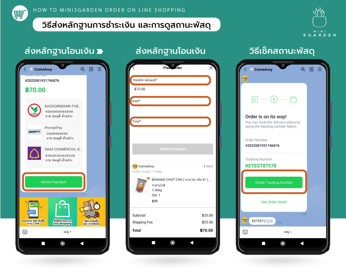 11. หลังจากทางร้านตรวจสอบการสั่งซื้อ และชำระเงินแล้ว จะยืนยันกลับ และทำการจัดส่ง แจ้งเลขพัสดุใน Line Chat