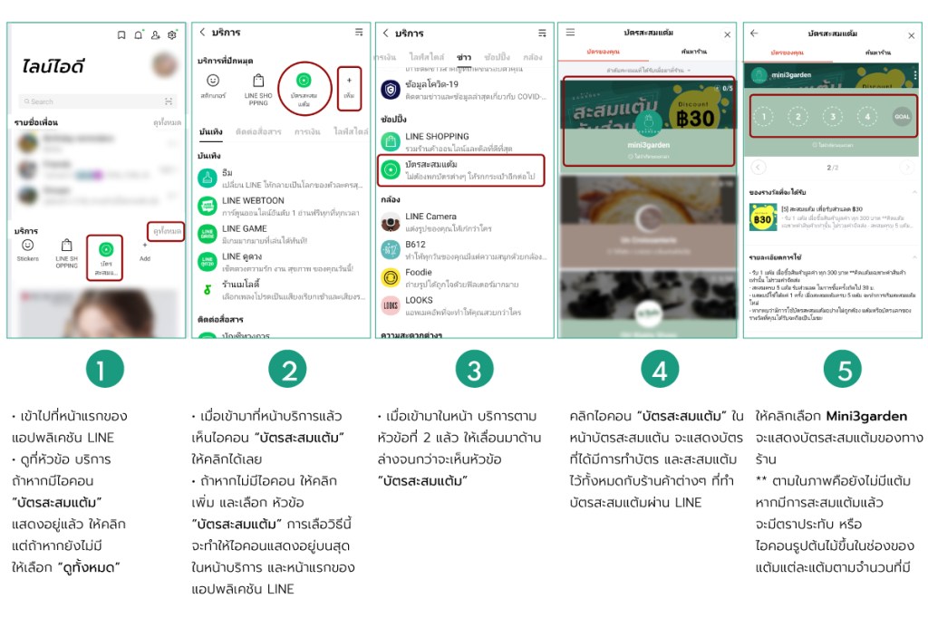 3. เข้าไปที่แอปพลิเคชัน LINE แล้วทำตามขั้นตอนดังนี้ ซึ่งวิธีนี้จะสามารถเช็คแต้ม และบัตรที่มีได้ทั้งหมด