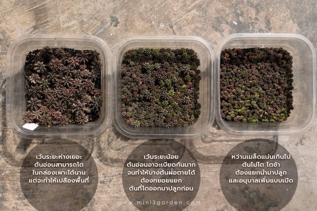 หากตอนโรย หรือหว่านเมล็ดนั้นมีความหนาแน่นกันจนเกินไป เมื่อต้นอ่อนโตขึ้นจนเริ่มเบียดกันจะเริ่มแย่งอาหารทำให้ต้นอ่อน โตช้า วิธีแก้หากต้นเริ่มมีการเบียดกันมากเกินไป ให้แยกต้นที่โตพอปลูกได้แยกออกมาปลูกก่อน และต้นที่ยังเล็กไม่สมบูรณ์เลี้ยงไว้ในกล่องต่อไป ฉะนั้นตอนโรยเมล็ดควรเว้นระยะห่างให้พอเหมาะ การกะระยะแบบคร่าวๆ โดยใช้นิ้วก้อยเราแทนต้นอ่อน แล้วเว้นระยะให้เหมาะสม