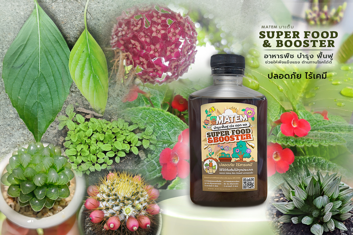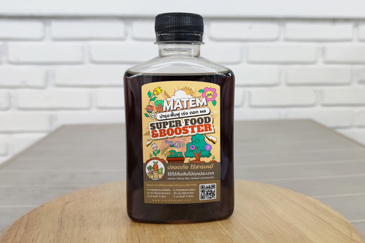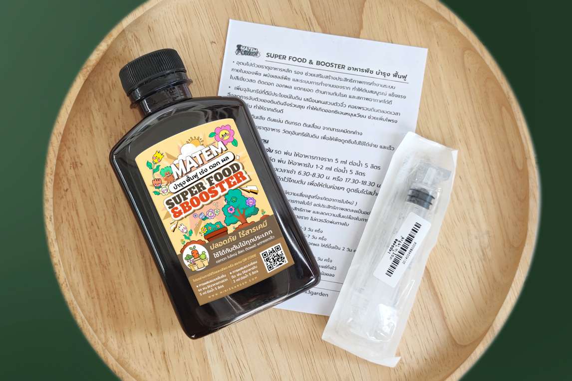 - MATEM Super food & Booster อาหารพืชชนิดน้ำเข้มข้น == อุดมด้วยธาตุอาหารที่สำคัญต่อพืช ช่วยบำรุง และฟื้นฟูต้นให้สมบูรณ์ แข็งแรง ติดดอก ออกผล รากแน่น