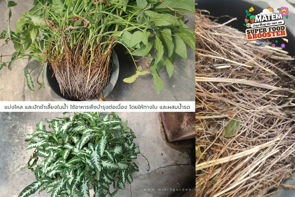 ให้ใช้ MATEM Super food & Booster อาหารพืชชนิดน้ำเข้มข้น ผสมน้ำแบบเจือจางฉีดพ่น ทุกๆ 2-3 วัน + MATEM POWER อาหารจานด่วนบำรุงพืช ชนิดน้ำ ผสมเข้มข้น รดลงดิน 7-10 วัน / ครั้ง